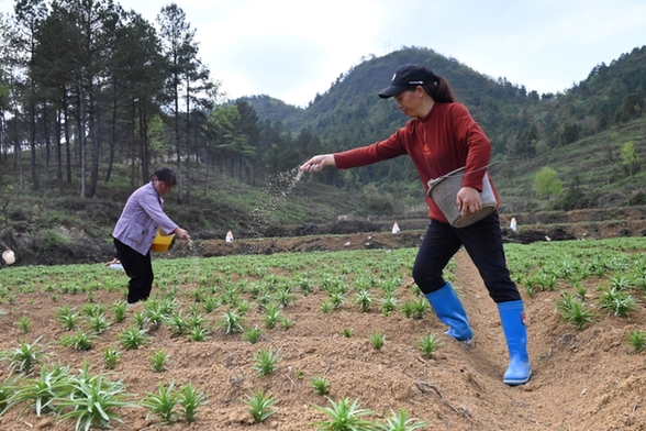在岑鞏縣天馬鎮白岩坪村百合種植基地,村民歐國蘭在給百合施肥。(吳啟萍 攝)