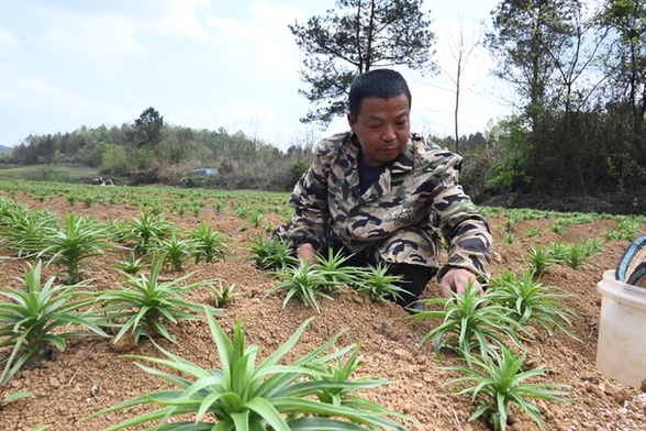 在岑鞏縣天馬鎮白岩坪村百合種植基地,種植大戶張明富正在查看百合長勢。(吳啟萍 攝)