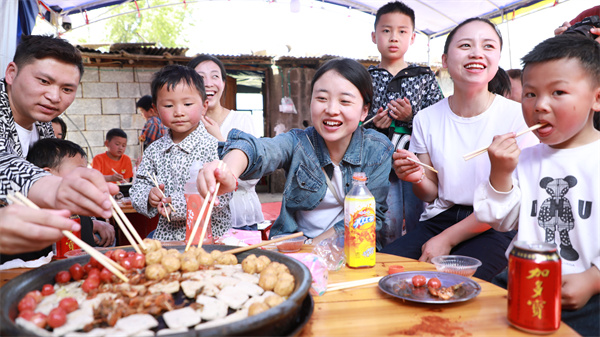 4月17日,游客在貴州省大方縣石桅村農家樂享受美食。周訓貴 攝