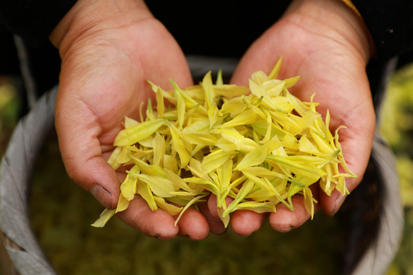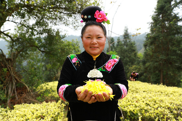 4月18日,貴州省劍河縣太擁鎮翁王村白茶種植基地,茶農展示剛採摘的茶葉。