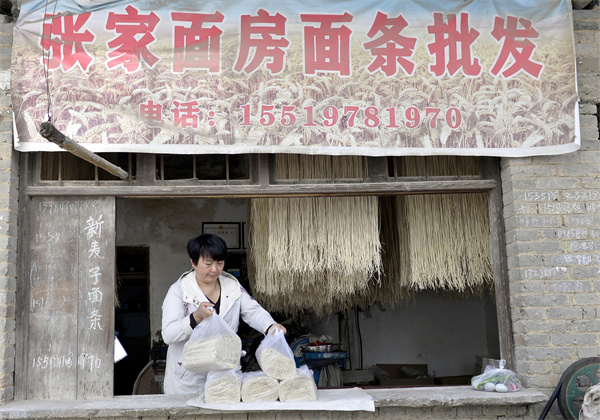 “長石麵條”物美價不廉,消費群體不夠廣。高林鳳介紹,作坊生産的麵條就擺在家裏面銷售,大部分是回頭客上門取貨,有的個體商戶拿到城鎮街上售賣,有的單位食堂長期訂制,有的帶去送親朋好友,附近的老百姓則更願意自己背着小麥來加工麵條,因為那樣更實惠一些。