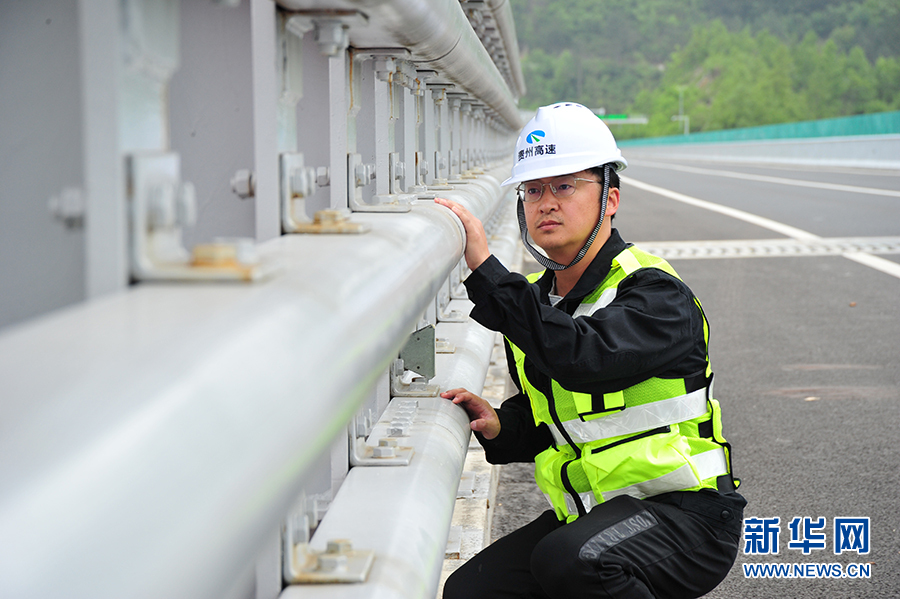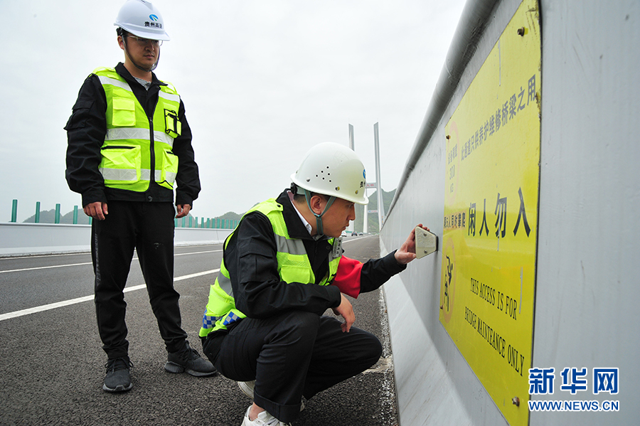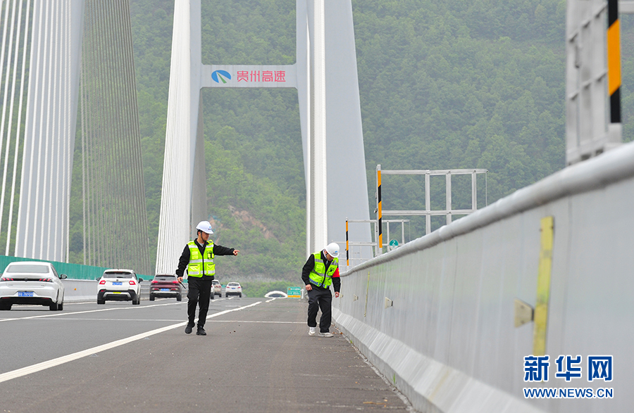 4月30日,道路綜合管理站的工作人員在都勻至安順高速公路雲霧大橋上查看護欄螺絲是否松動。新華網 盧志佳 攝