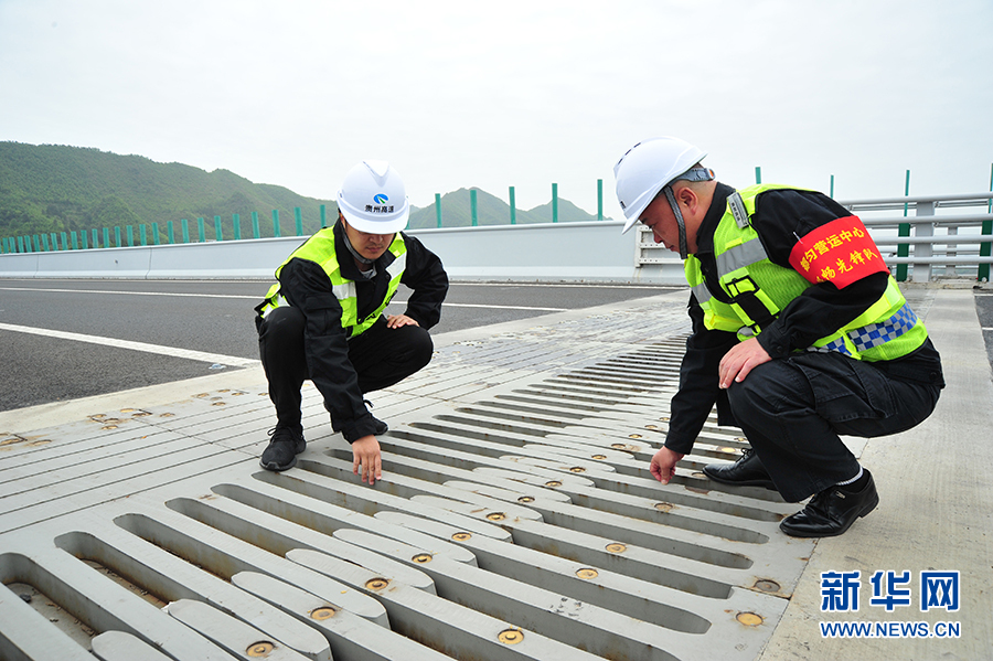 4月30日,道路綜合管理站的工作人員在雲霧大橋上查看是否有雜物影響橋面伸縮縫運行。新華網 盧志佳 攝