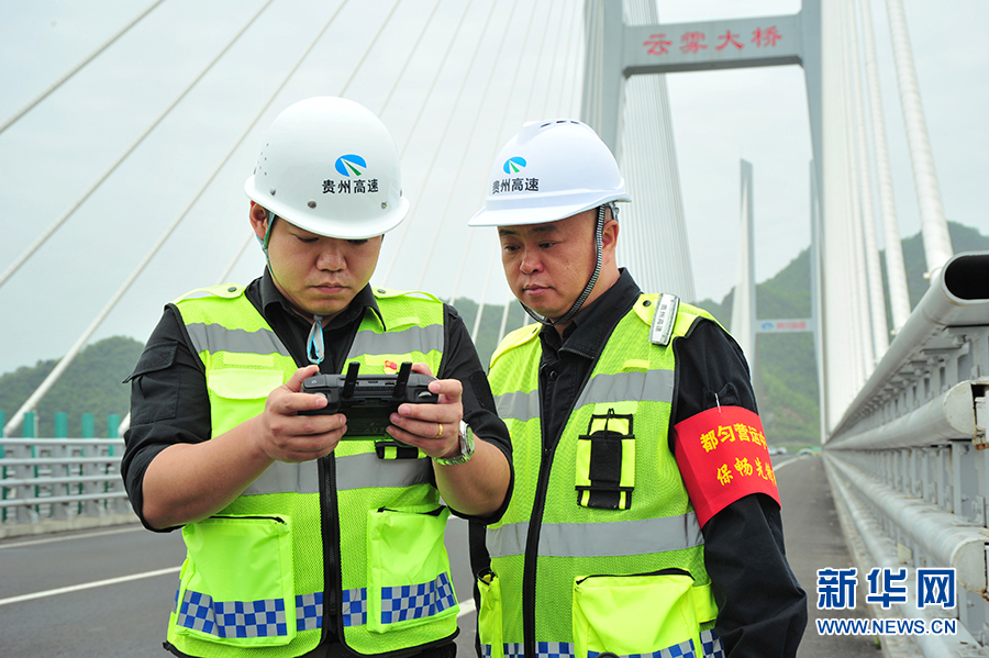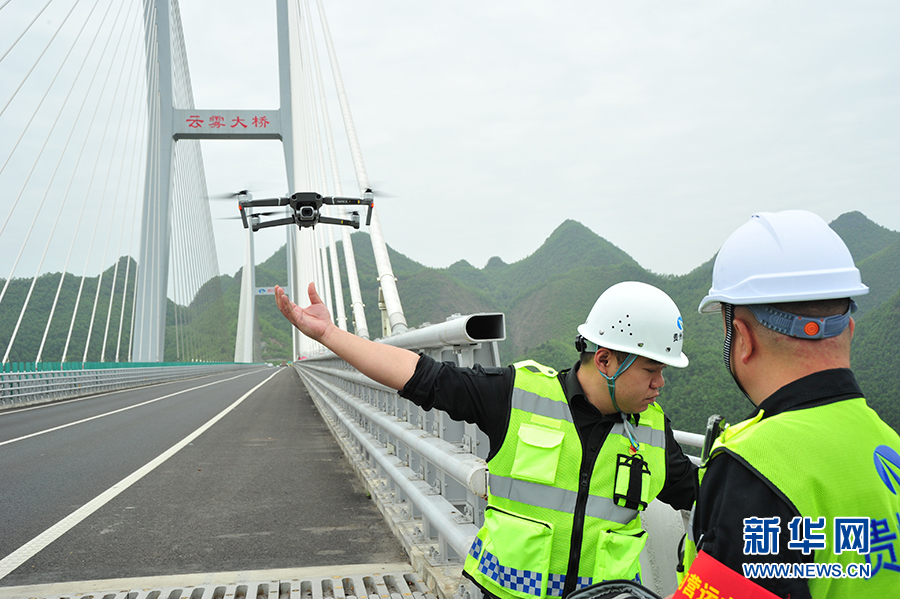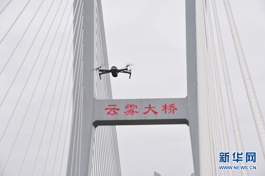 4月30日,工作人員通過無人機對雲霧大橋拉索的狀態進行觀測記錄。雲霧大橋“體型”巨大,無人機觀測可大大提高檢測能力和效率。新華網 盧志佳 攝