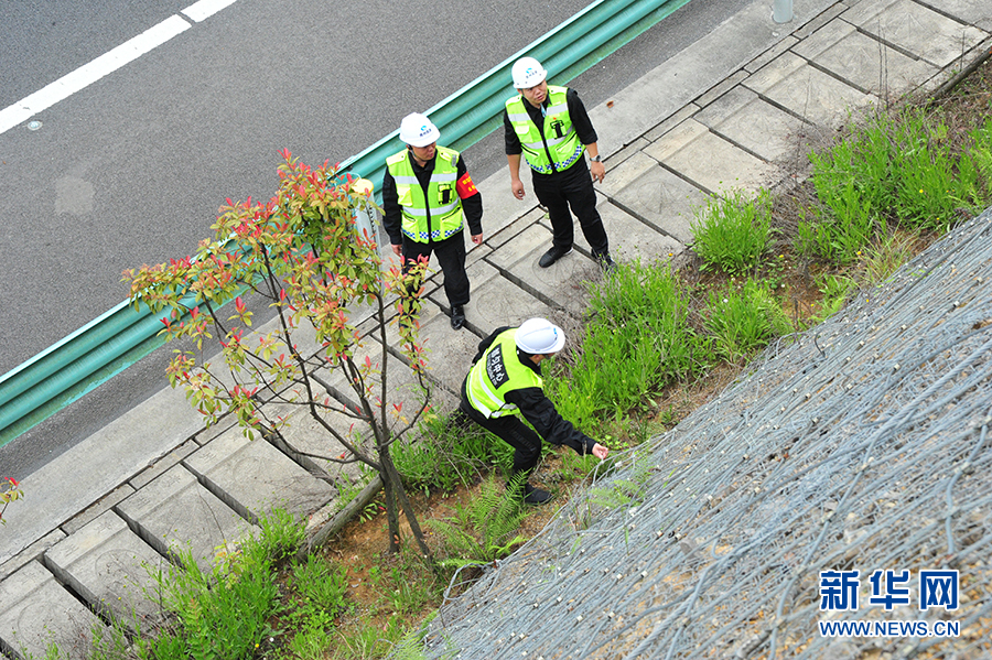 4月30日,工作人員在檢查邊坡防護網是否松動。新華網 盧志佳 攝