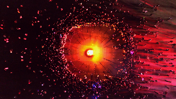 精彩的歌舞表演後,另一邊,熊熊的火苗在廣場中間燃燒跳躍,點燃了在場訪客、群眾們的熱情,他們手挽着手,圍着篝火,伴隨音樂的律動,載歌載舞共同度過美好的假期。