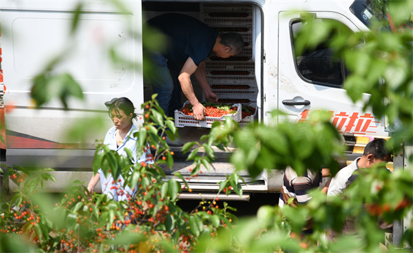 “收購的價格每天都不同,要看他們採摘品質的好壞。”收購商一邊將剛到來的櫻桃裝箱,一邊和果農們解釋着價格波動的原因,平均每天要收3到4千斤櫻桃,裝箱之後運往市內各大批發市場,供不應求。