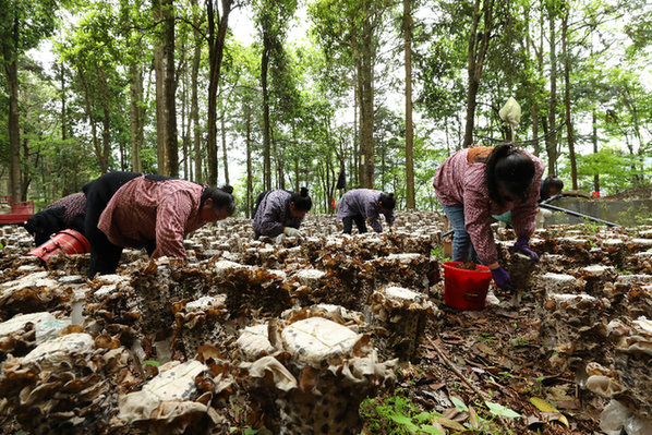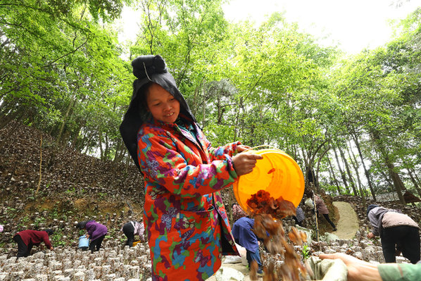 劍河縣久仰鎮久丟村村民在采收黑木耳。(楊家孟 攝)