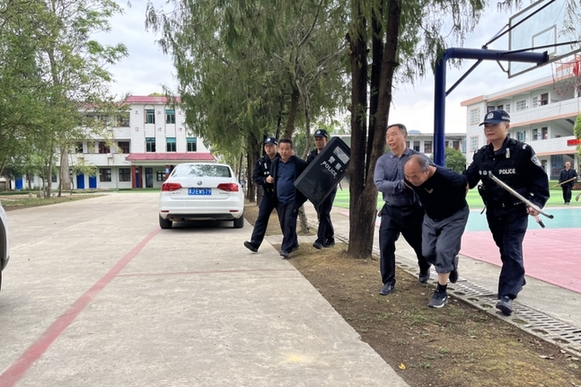 演練採取模擬突發事件的形式,由兩名“暴恐分子”持刀強行闖入校園,試圖傷害在校師生,面對緊急情況,門衛值守保安人員立即作出快速反應,啟動校園“一鍵報警”裝置,保安和老師立即使用防暴鋼叉、盾牌等器材與“暴恐分子”周旋,派出所民警及時趕到現場,與安保人員相互配合,成功將“暴恐分子”制服。