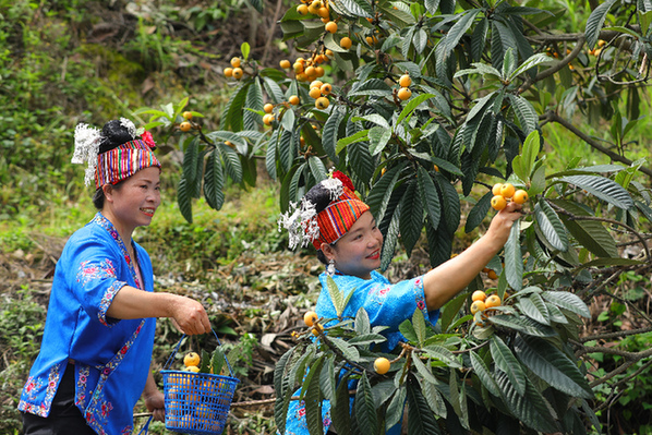 五月的貴州省劍河縣柳川鎮鎮江村,碧綠的樹上挂滿了黃澄澄的五星枇杷,猶如一盞盞金燦燦的小燈籠,夾雜在綠葉中。