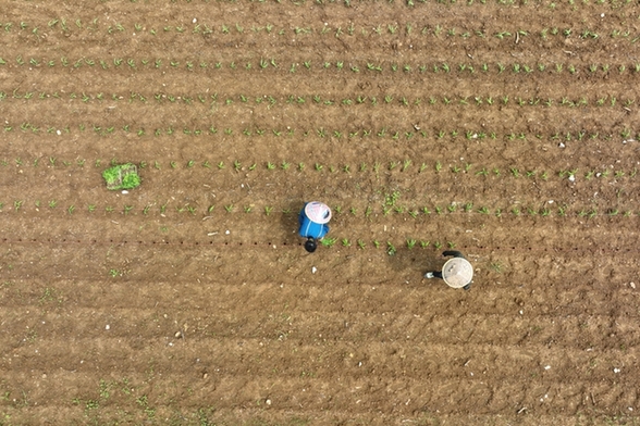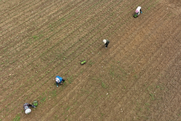 岑鞏縣天馬鎮雷公田村,村民在移栽高粱苗。(萬再祥 攝)