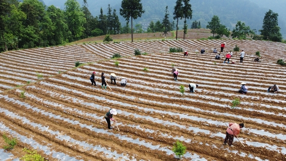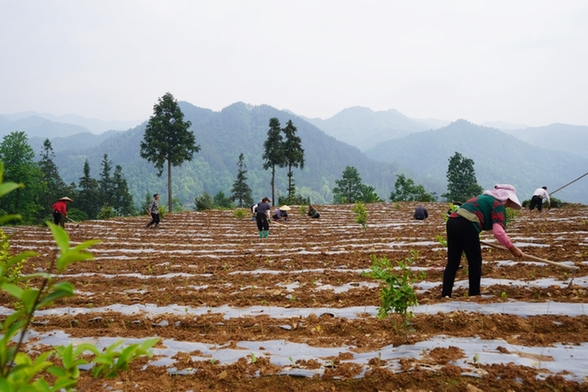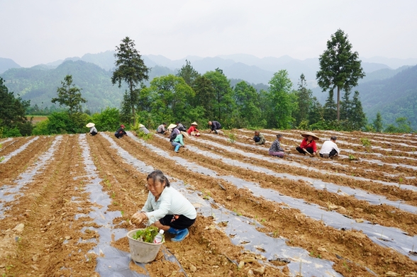 岑鞏縣龍田鎮龍溪村虎杖基地,村民們分工協作有序移栽虎杖苗。(陳昆 攝)