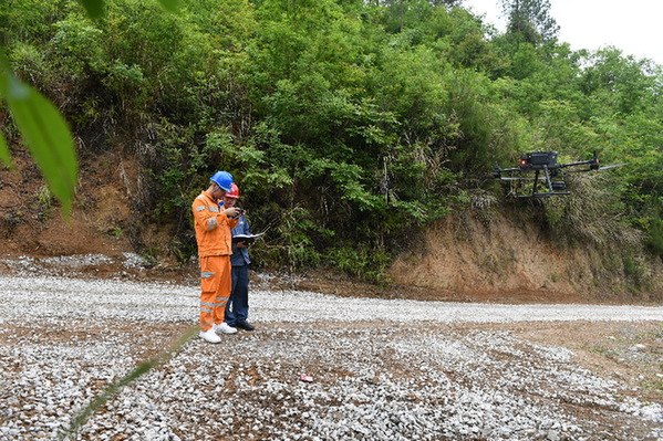 在黔南州荔波縣甲良鎮甲新村10千伏方甲線精益化巡視現場,南方電網貴州都勻供電局工作人員起飛無人機。(龍定錦 攝)