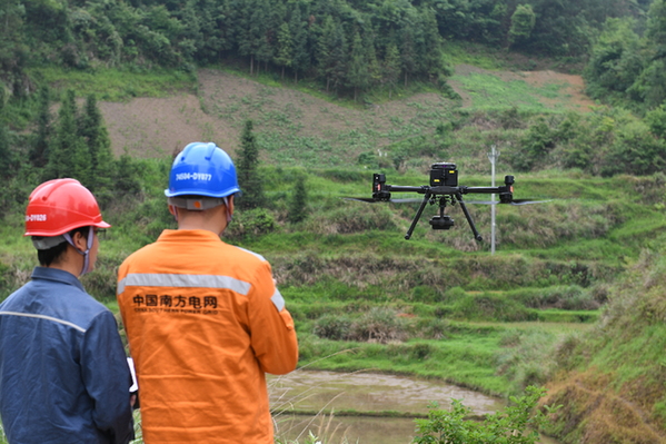 裝電池、開機、推搖桿……在黔南州荔波縣甲良鎮甲新村10千伏方甲線甲中支2號桿處,來自南方電網貴州都勻供電局的2個工作人員,熟練地操縱着一架四翼無人機,對線路進行精細化巡視,找出“疾病”、對症“下藥”,切實保障配電線路安全穩定運行。