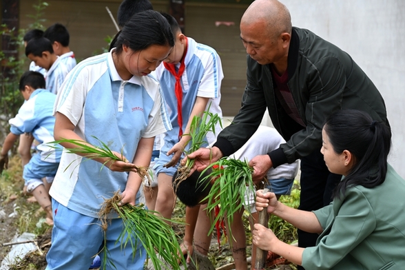 岑鞏縣龍田鎮中心小學勞動教育基地,老師向學生示範如何正確插秧。(印有紅 攝)