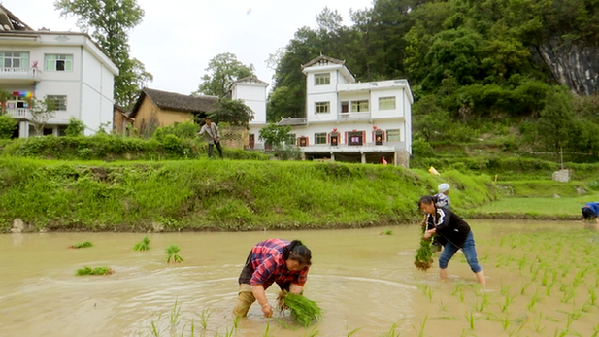在擺洗村的各塊水田裏,耕田機來回穿梭,整田待插秧苗。另一邊,群眾熟練地栽插秧苗,動作如蜻蜓點水,輕盈、快速、準確。不一會,水田很快穿上“綠裝”,生機勃勃。