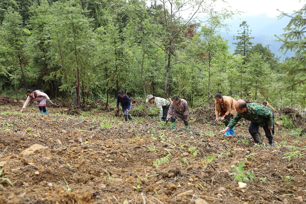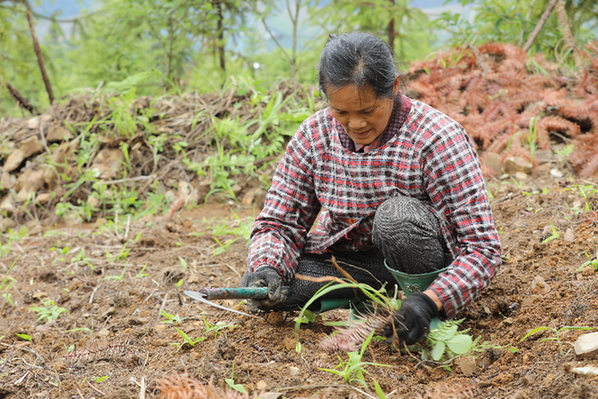 農戶正在管護淡竹葉。(張碧桃 攝)