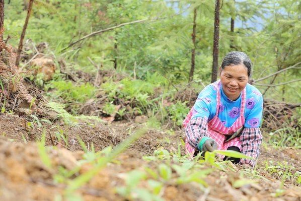 雨後,種植基地裏的淡竹葉在一夜之間就長了不少,同樣一起猛長的還有海量的雜草,務工人員吳代花和她的夥伴們的主要任務就是對付這些雜草,只見大傢伙兒麻利地將雜草拔出、割斷。
