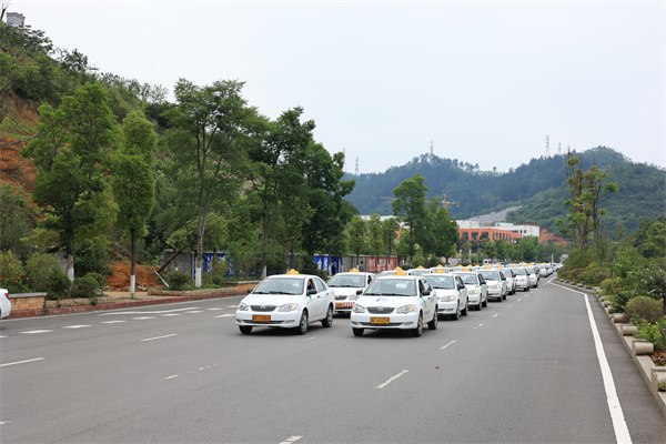 發車儀式上,鵬程駕校70余輛教練車準備就緒,整齊緩慢地穿過街道,一起出發為城區考生提供免費乘車服務;車隊分佈在城區12個考點,其中十余輛車停靠在蘭苑中學門口,靜等考生出場,為參加高考的考生加油打氣、保駕護航。