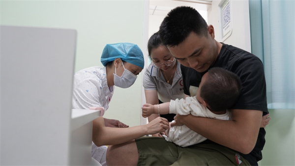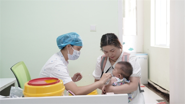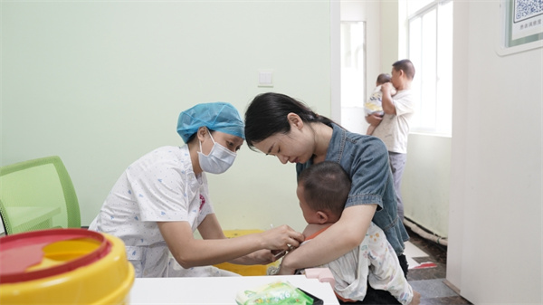 市民帶着小朋友在岑鞏縣婦幼保健院預防接種門診接種疫苗。(胡國鑫 攝)