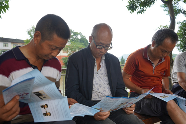 岑鞏縣客樓鎮白家壩村法治文化長廊內,村民在集中學習法律知識。(吳念 攝)