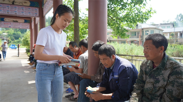 村幹在向群眾發放普法知識手冊。(吳念 攝)