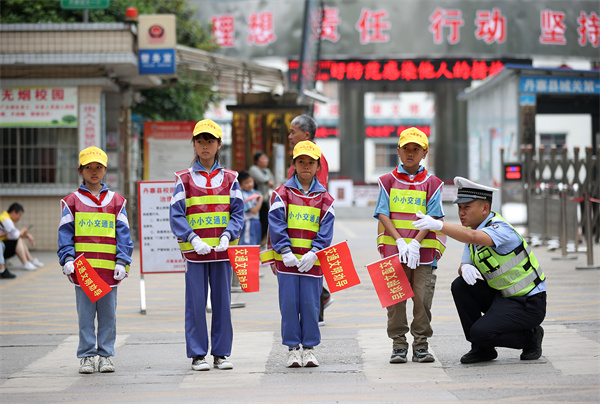 近日,在貴州省黔東南苗族侗族自治州丹寨縣城關第一小學門外馬路上,交警在給“小交通員”講述現場指揮交通的要領。