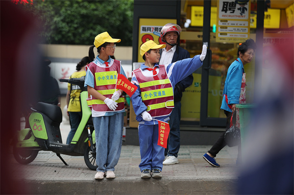 近日,在貴州省黔東南苗族侗族自治州丹寨縣城關第一小學門外馬路上,“小交通員”在現場指揮交通。