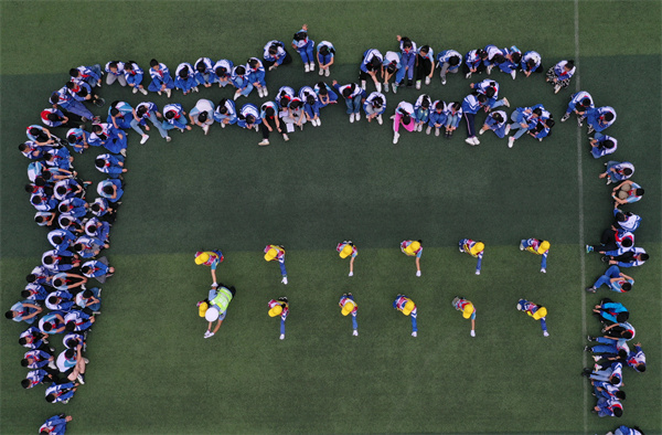 近日,貴州省黔東南苗族侗族自治州丹寨縣城關第一小學的“小交通員”跟着交警學習交通手勢(無人機照片)。