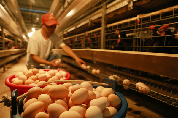 工人在蛋雞養殖場撿收雞蛋。 (彭郡 攝)