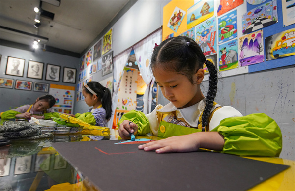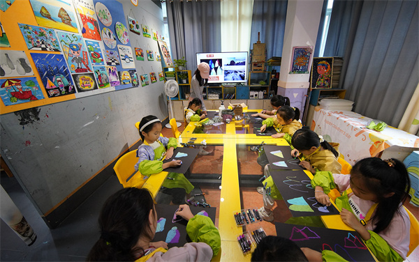 7月18日,小朋友在貴州省黔東南苗族侗族自治州丹寨縣一家美術培訓中心學習繪畫。