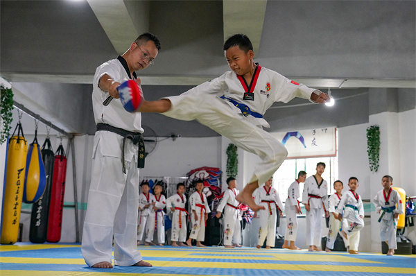 7月18日,孩子們在貴州省黔東南苗族侗族自治州丹寨縣一家跆拳道館練習跆拳道。