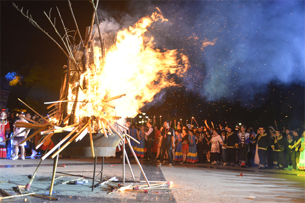 當晚九時許,在貴州宣慰府主會場,最激動人心“火把狂歡夜”正式開啟,用原始方法取到的“火種”點燃了千百支火把,千百支火把形成壯觀的火游向主會場的三個火塘轉了三圈,舉行了神聖的點火儀式後, 上萬名觀眾和游客圍着熊熊篝火跳起了歡快的《烏蒙歡歌》,大家手牽手、心相連、夢相牽,情相融,廣大游客朋友和彝族同胞盡情地體驗“東方狂歡節”的熱烈與激情,真切體驗民族文化風情的盛宴。“為了來參加今天的火把節活動,我們一家人都來了,現場非常震撼,各民族的同胞在一起其樂融融的氣氛,讓我覺得自己作為中華兒女的一員,倍感自豪。”楊晨希激動地説。