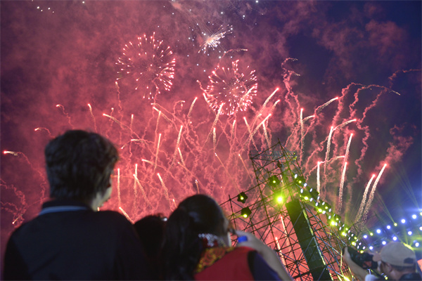 游客在大方火把狂歡夜現場觀看煙花秀。鄭吉軍 攝
