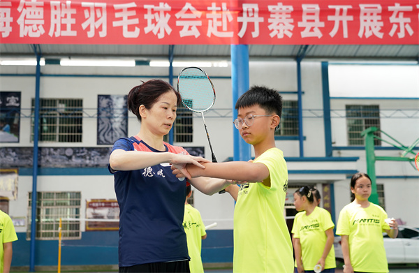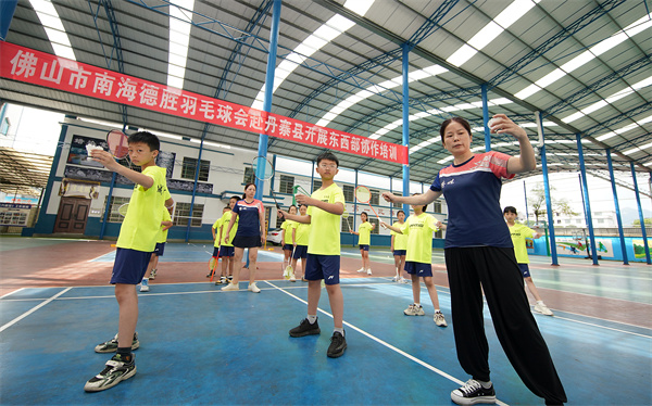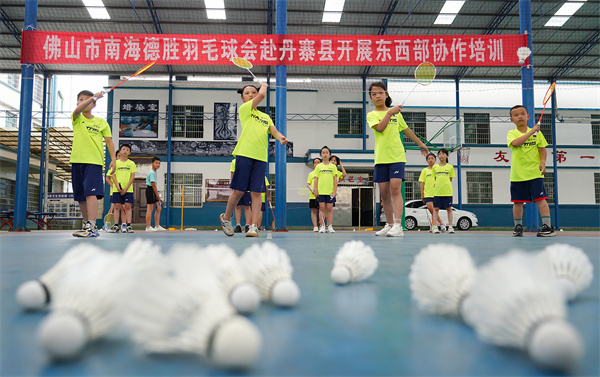 7月26日,在貴州省黔東南苗族侗族自治州丹寨縣城關第一小學暑期羽毛球免費培訓課上,來自廣東佛山市南海區的志願者在輔導孩子們練習打羽毛球的基本動作。