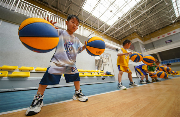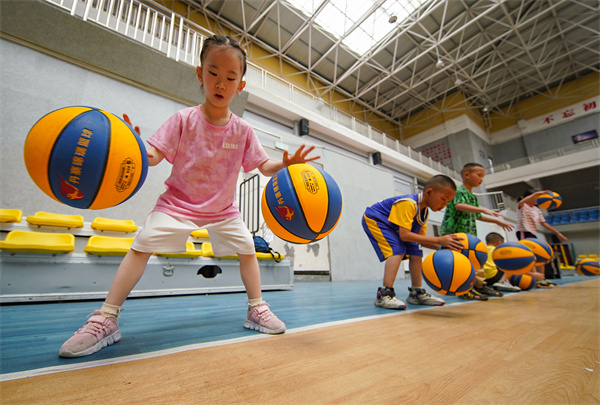 7月26日,在貴州省黔東南苗族侗族自治州丹寨縣體育館暑期免費籃球訓練課上,孩子們在練習運球基本功。