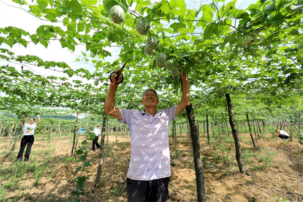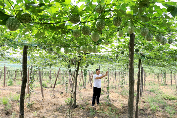 “吊瓜,又名栝樓,藥食兩用,具有一年種植投入,多年收穫受益特點。”天星鄉三星村黨支部書記王振華介紹,吊瓜産業引進來後,以前無人願意耕種的荒山荒地都盤活了,還能幫助當地村民實現家門口就業,增加收入。