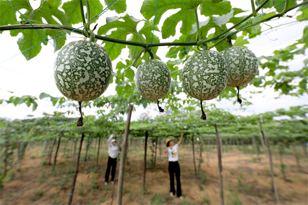 岑鞏縣天星鄉三星村吊瓜種植基地,村民在管護吊瓜。(萬再祥 攝)