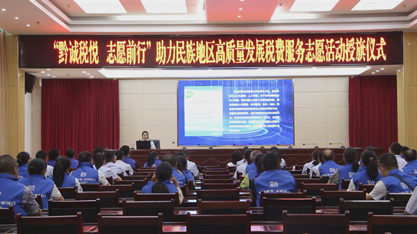 儀式上,黔南州稅務局介紹“黔誠稅悅·志願前行”志願服務平台,貴州省稅務局、黔南州稅務局共同為三都水族自治縣稅務局授旗。