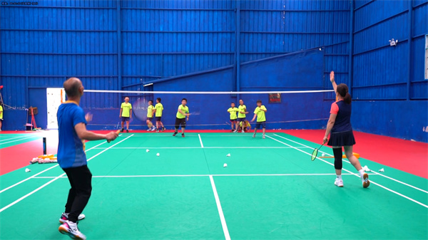 在羽毛球館內,來自廣東省佛山市南海區的教練正從握拍、揮拍等方面進行全方位的教學指導,隨後,與15位學生進行一對一練習,對每個學生出現的錯誤地方進行講解及糾正,進一步鞏固學習成果,同學們興致高漲,充分感受着羽毛球運動的魅力。