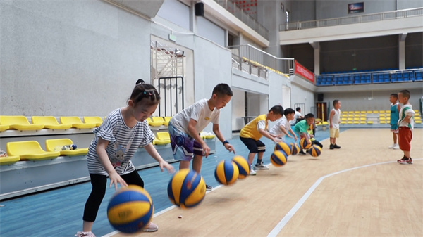 除了羽毛球外,籃球也是充實假期生活的方式之一。在縣體育館內,小朋友們正在參加籃球訓練運動,在教練的指導下有序進行運球、傳球、投籃技術,孩子們在場上揮汗如雨,在強健體魄中度過一個快樂而又有意義的假期。