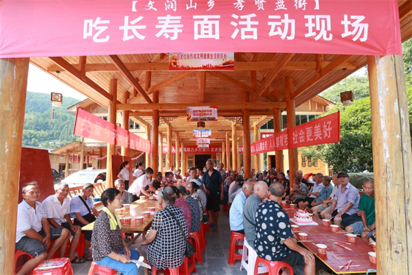 活動現場,全村上百名70歲以上老人歡聚一堂,黨員志願者、工作人員向老人們宣傳法治知識,並為他們送上生日蛋糕及長壽面,在歡樂祥和的氣氛中為老人們集體祝壽。