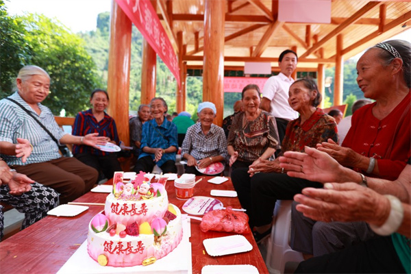 岑鞏縣思旸鎮盤街村老人集體吃生日蛋糕。(唐鵬 攝)