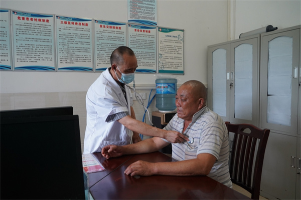 岑鞏縣天馬鎮中心衞生院,醫生在給病人檢查身體。(朱勝攀 攝)