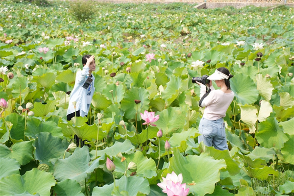 岑鞏縣客樓鎮下寨村,游客在荷花基地拍照。(蔣志敏 攝)