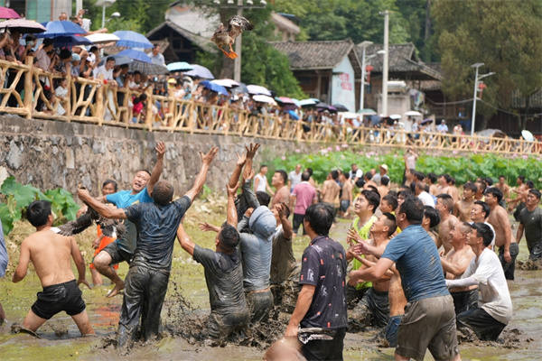 在“趣味捉魚”活動中,田內一片沸騰,迸濺的水花聲、觀眾們的加油聲此起彼伏。在搶鴨子環節,參賽選手各出奇招、各顯神通,圍觀的群眾也興奮不已、拍手叫好,將整場活動氣氛推向高潮。