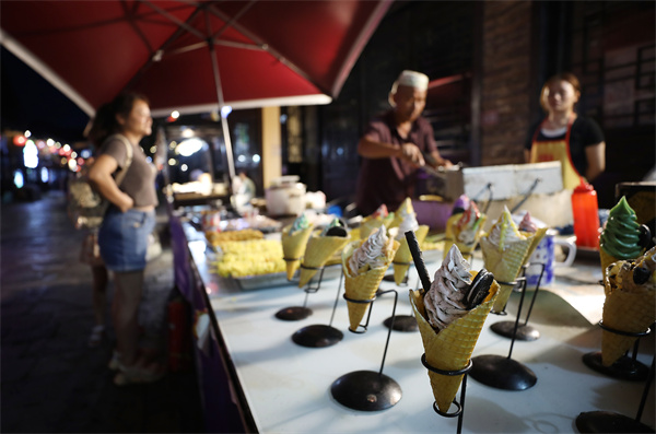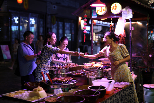 8月11日,游客在貴州省黔東南苗族侗族自治州丹寨縣萬達小鎮休閒街區購買小吃。