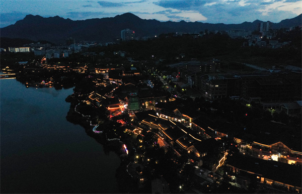 8月11日拍攝的貴州省黔東南苗族侗族自治州丹寨縣萬達小鎮夜景(無人機照片)。