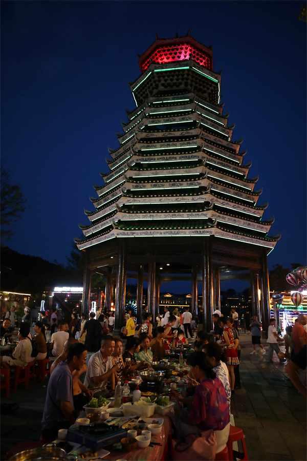 8月11日,游客在貴州省黔東南苗族侗族自治州丹寨縣萬達小鎮休閒街區品嘗長桌宴。