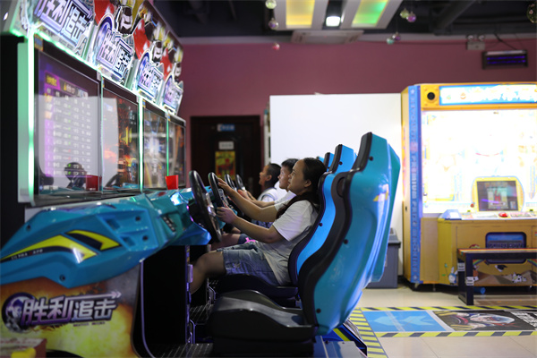 8月11日,游客在貴州省黔東南苗族侗族自治州丹寨縣萬達小鎮休閒街區打電玩。